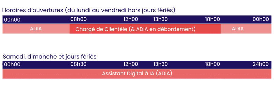 En Horaires Ouvrés (HO) de 8h30 à 18h00 du lundi au vendredi (hors jours fériés) : conseiller clientèle en « front » supporté par un agent IA vocal (callbot) en cas de débordement,